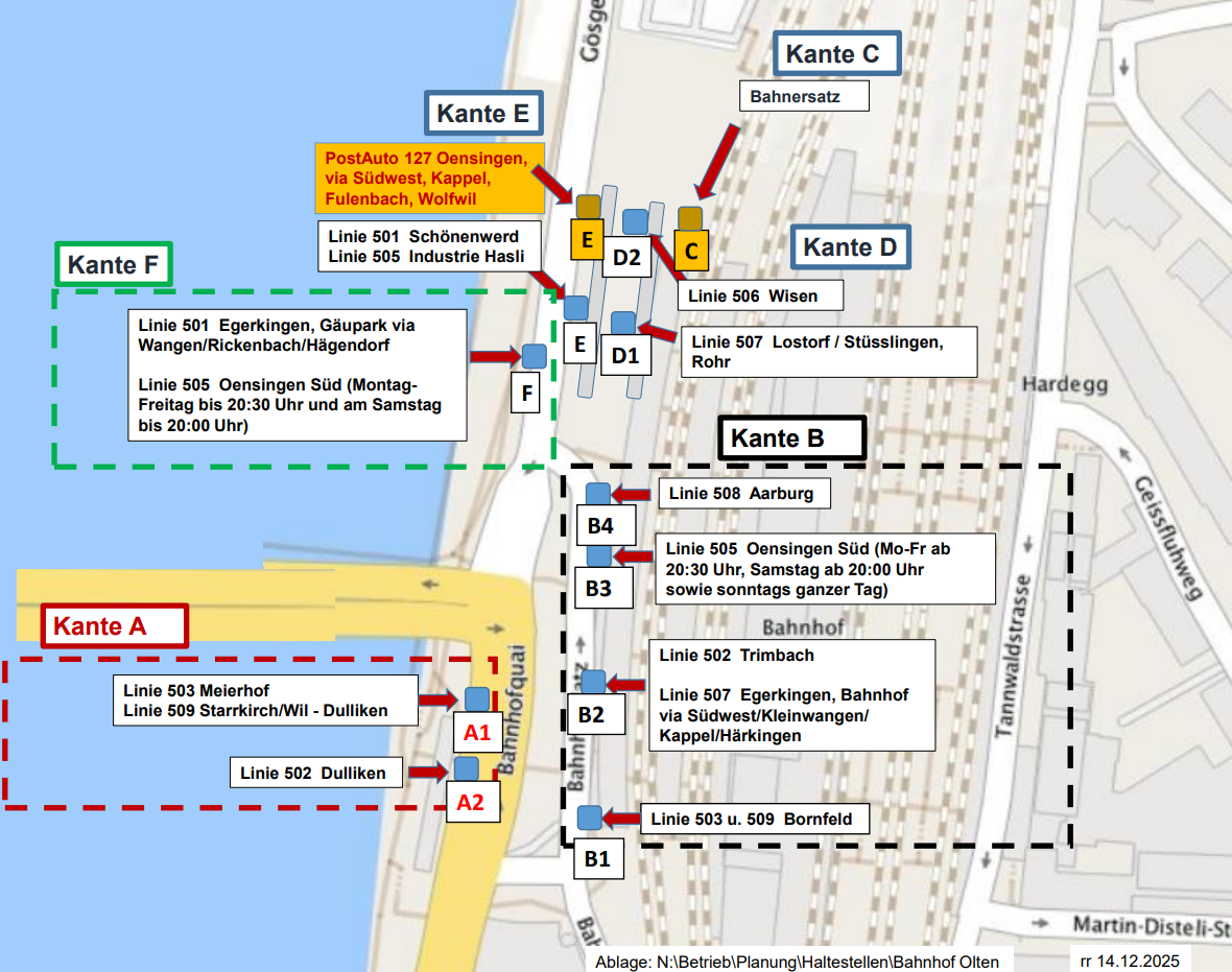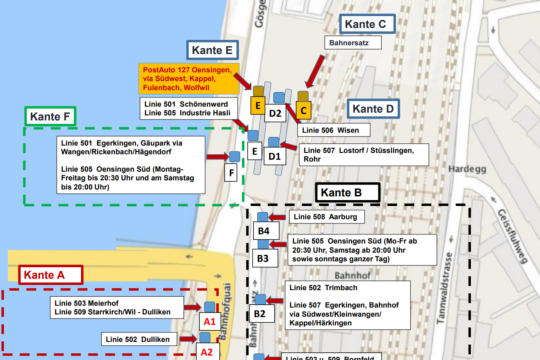 Entdecken Sie den aktuellen Übersichtsplan der Bushaltestellen am Bahnhof Olten. So wissen Sie genau, wo Ihr Bus abfährt und können Ihre Weiterreise optimal planen.